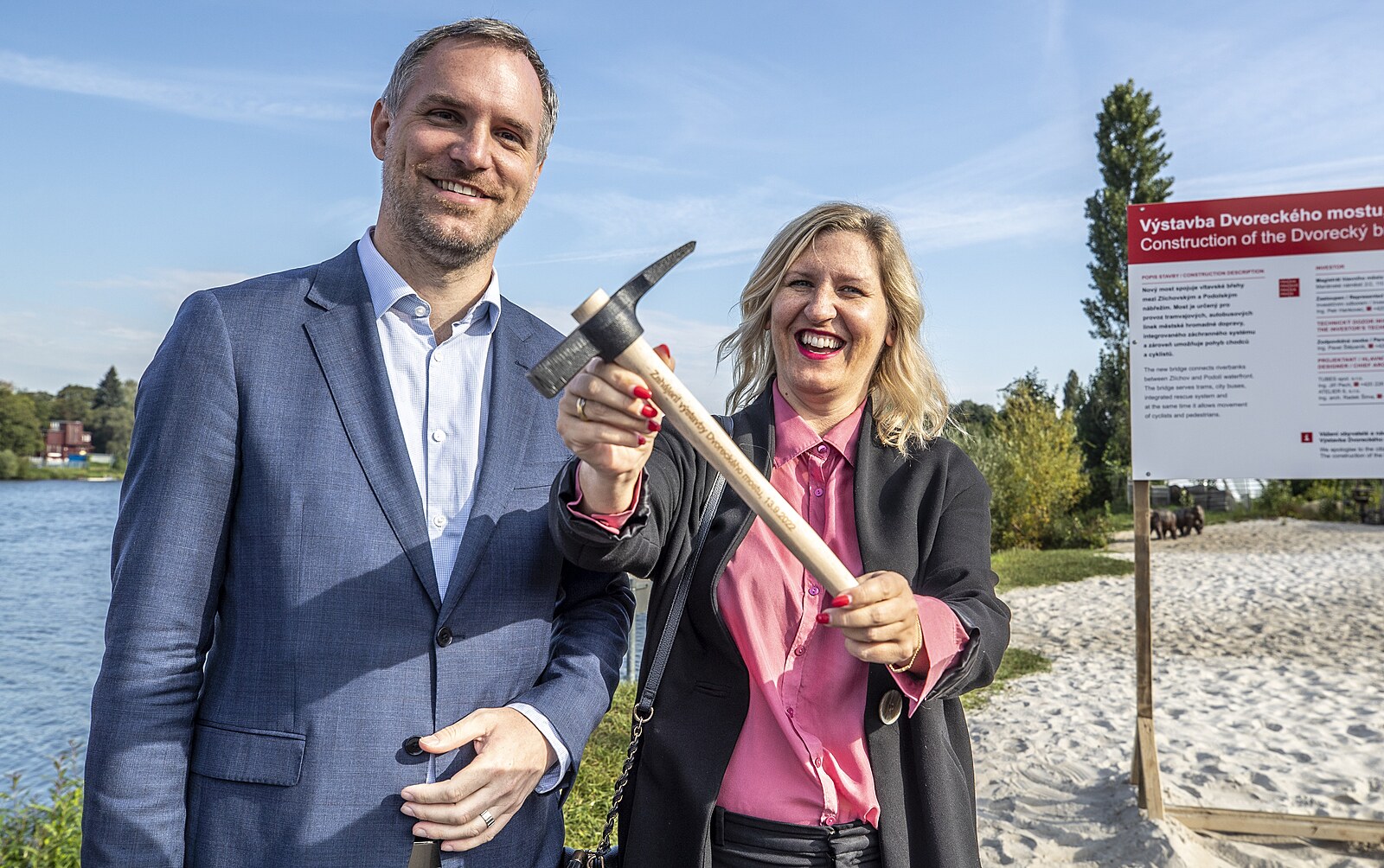 Slavnostní zahájení stavby Dvoreckého mostu přes Vltavu ve Žlutých lázních. Na snímku zleva primátor Zdeněk Hřib a radní Hana Třeštíková. (13. září 2022)