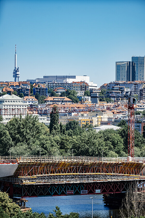 Stavba Dvoreckého mostu se chýlí ke svému konci. Pod prostřední částí ještě zůstává konstrukce bednění. (30. června 2025)