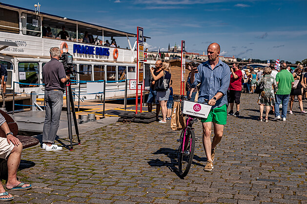 Kdo nemá kolo a pěšky se mu nechce, může ve vyloučeném úseku využít zdarma sdílená kola. (7. srpna 2021)