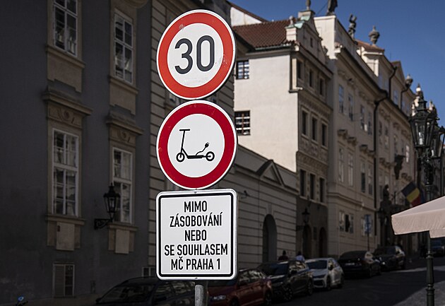 Zákaz elektrokoloběžek v dolní části Nerudovy ulice nad Malostranským náměstím (26. srpna 2025)