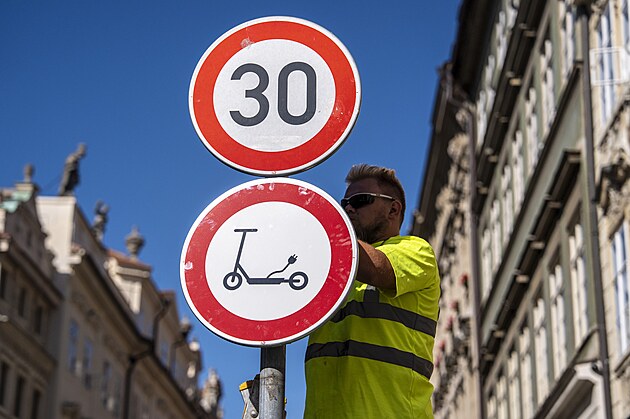 Do Nerudovy ulice na Malé Straně nesmí elektrokoloběžky. Radnice Prahy 1 na jejím začátku a konci v úterý osadila dvě dopravní značky, které vjezd zakazují. (26. srpna 2025)