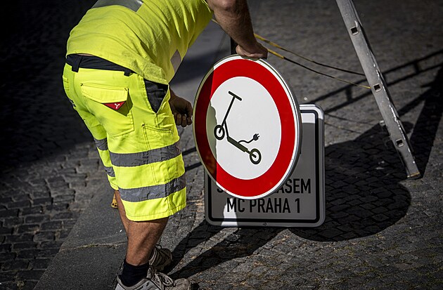 Do Nerudovy ulice na Malé Straně nesmí elektrokoloběžky. Radnice Prahy 1 na jejím začátku a konci v úterý osadila dvě dopravní značky, které vjezd zakazují. (26. srpna 2025)