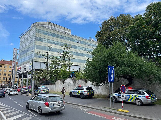 V nákupním středisku Flora zasahují policisté kvůli hrozbě uložené výbušniny. (21. května 2025)