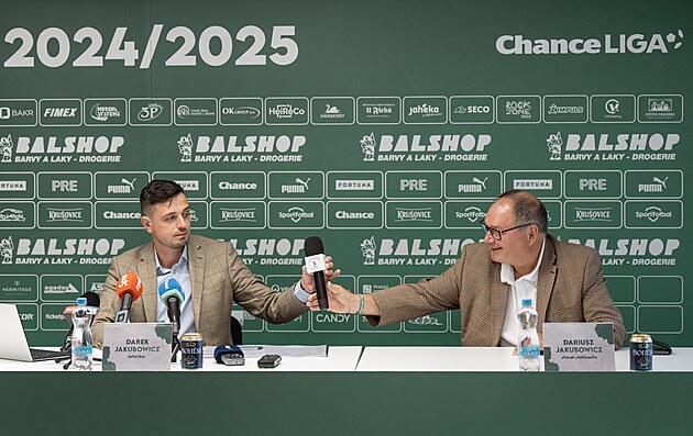 Ředitel klubu Darek Jakubowicz a předseda představenstva Dariusz Jakubowicz na tiskové konferenci k představení vizualizace nového Ďolíčku.
