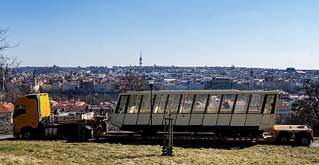 Odvoz současných vozů lanové dráhy na Petřín. Demontováním dvou vozů z lanové dráhy na Petříně začala její rekonstrukce. Jeden z vozů se mezitím přesune do Muzea městské hromadné dopravy ve Střešovicích, druhý pak do depozitáře Národního technického muzea v Chomutově. (18. března 2025)