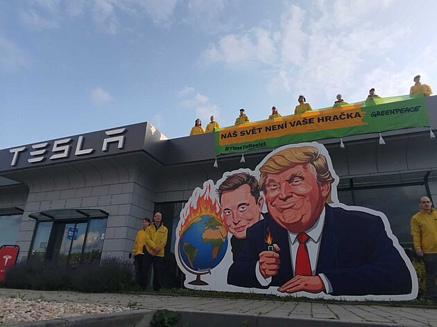 Aktivisté z Greenpeace na střeše prodejny Tesla v Čestlicích u Prahy. (11. června 2025)