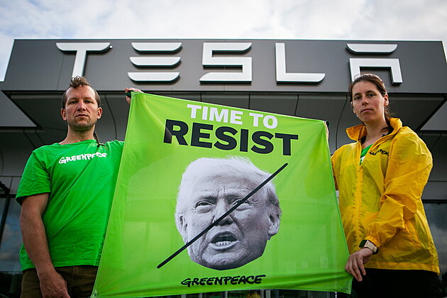 Aktivisté z hnutí Greenpeace vylezli ráno na střechu prodejny Tesla v Čestlicích u Prahy, protestují proti chování Trumpa a Muska. (11. června 2025)