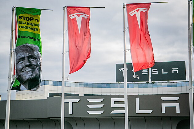Aktivisté z hnutí Greenpeace vylezli ráno na střechu prodejny Tesla v Čestlicích u Prahy, protestují proti chování Trumpa a Muska. (11. června 2025)