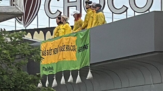 Aktivisté z Greenpeace na střeše prodejny Tesla v Čestlicích u Prahy. (11. června 2025)