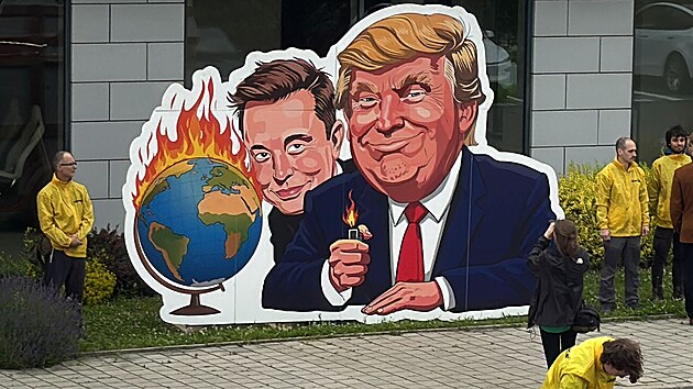 Aktivisté z hnutí Greenpeace vylezli ráno na střechu prodejny Tesla v Čestlicích u Prahy, vyjadřovali protest proti počínání Donalda Trumpa a Elona Muska. (11. června 2025)