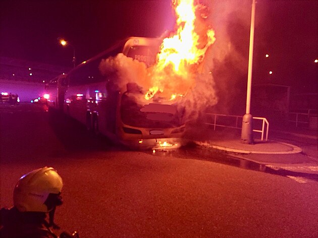 V pražských Holešovicích krátce po půlnoci hořel dálkový autobus. (3. září 2025)
