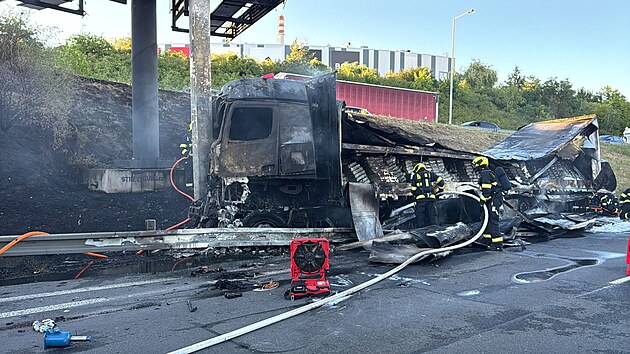 Na Jižní spojce u Štěrbohol vzplál kamion. (30. června 2025)