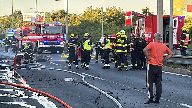 Na Jižní spojce u Štěrbohol vzplál kamion. (30. června 2025)
