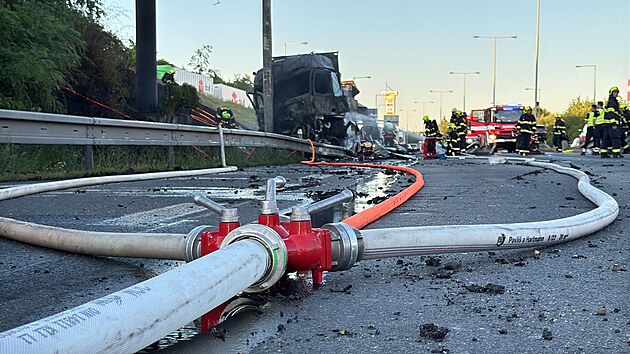 Na Jižní spojce u Štěrbohol vzplál kamion. (30. června 2025)