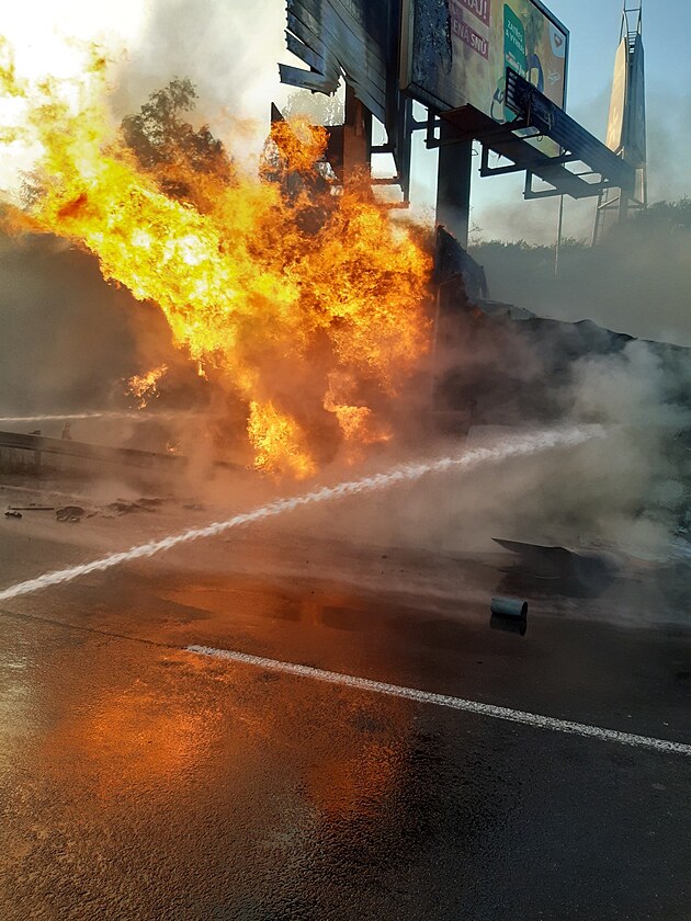 Na Jižní spojce u Štěrbohol vzplál kamion. (30. června 2025)
