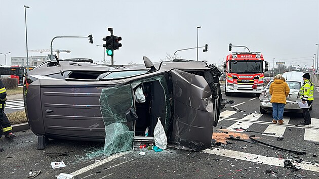 Srážka několika aut zablokovala provoz před obchodním centrem Metropole Zličín v Praze. (21. ledna 2025)