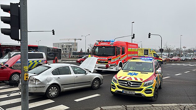 Srážka několika aut zablokovala provoz před obchodním centrem Metropole Zličín v Praze. (21. ledna 2025)