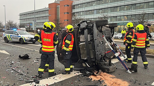 Srážka několika aut zablokovala provoz před obchodním centrem Metropole Zličín v Praze. (21. ledna 2025)