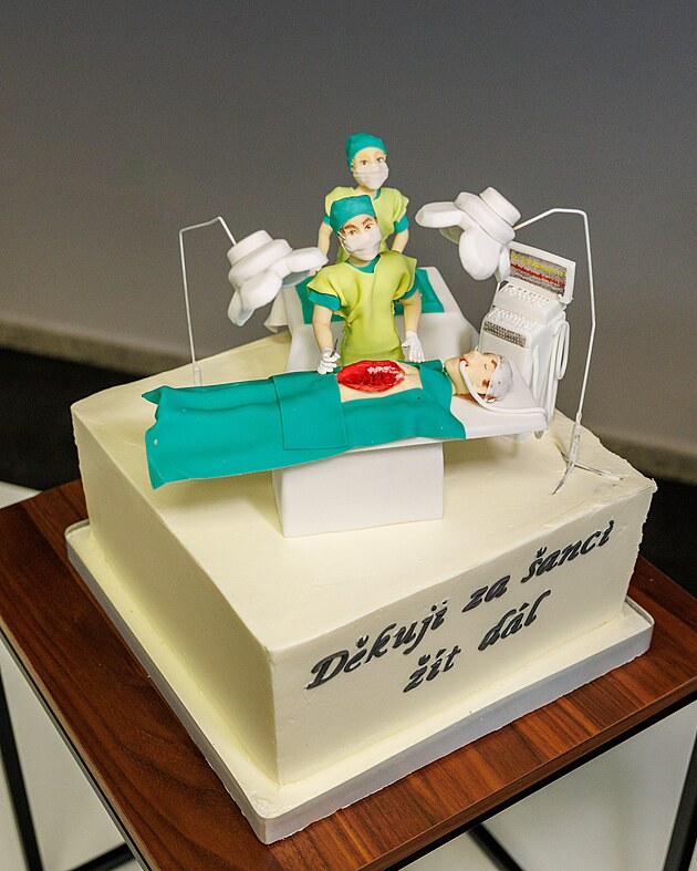 Pacient rok po úspěšné retransplantaci přinesl jako poděkování dort pro přednostu kliniky.