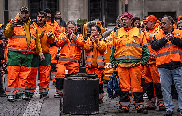 Před budovou pražského magistrátu, v níž dnes zasedají zastupitelé, demonstrují od rána zaměstnanci Pražských služeb. (27. března 2025)