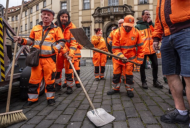 Před budovou pražského magistrátu na Mariánském náměstí, v níž dnes zasedají zastupitelé, demonstrují od rána zaměstnanci Pražských služeb. (27. března 2025)