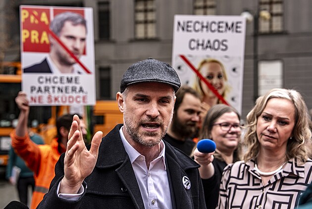 Zdeněk Hřib (Piráti) a Jana Komrsková (Piráti). Před budovou pražského magistrátu, v níž dnes zasedají zastupitelé, demonstrují od rána zaměstnanci Pražských služeb. (27. března 2025)