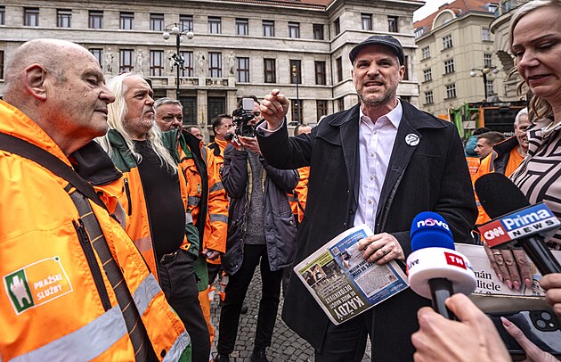 Zdeněk Hřib (Piráti) hovoří se zaměstnanci Pražských služeb, kteří demonstrují před budovou pražského magistrátu, v níž dnes zasedají zastupitelé. (27. března 2025)