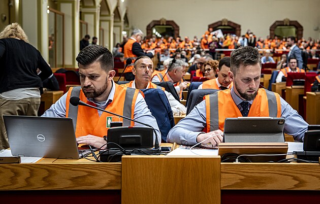 Někteří zastupitelé sedí v sále oblečeni v oranžových vestách, zaměstnanci PS obsadili v sále celý prostor pro veřejnost. (27. března 2025)