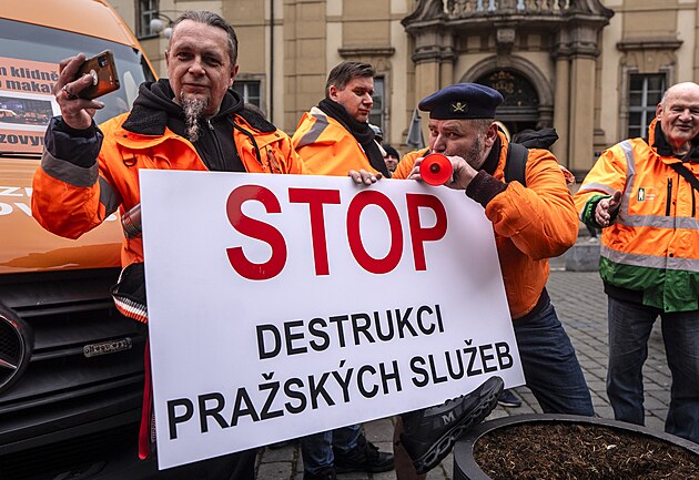 Před budovou pražského magistrátu na Mariánském náměstí, v níž dnes zasedají zastupitelé, demonstrují od rána zaměstnanci Pražských služeb. (27. března 2025)