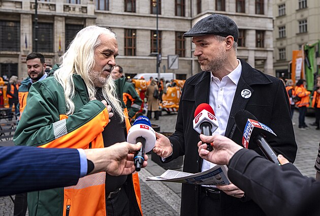 Zdeněk Hřib (Piráti) hovoří se zaměstnanci Pražských služeb, kteří demonstrují před budovou pražského magistrátu, v níž dnes zasedají zastupitelé. (27. března 2025)