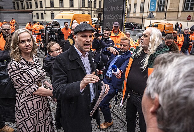 Zdeněk Hřib (Piráti) a Jana Komrsková (Piráti). Před budovou pražského magistrátu, v níž dnes zasedají zastupitelé, demonstrují od rána zaměstnanci Pražských služeb. (27. března 2025)