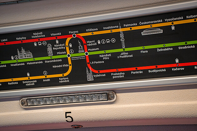Instalace nových schémat linek pražského metra, tzv. jezevčíků, do vagonů jednotlivých souprav (prosinec 2024)