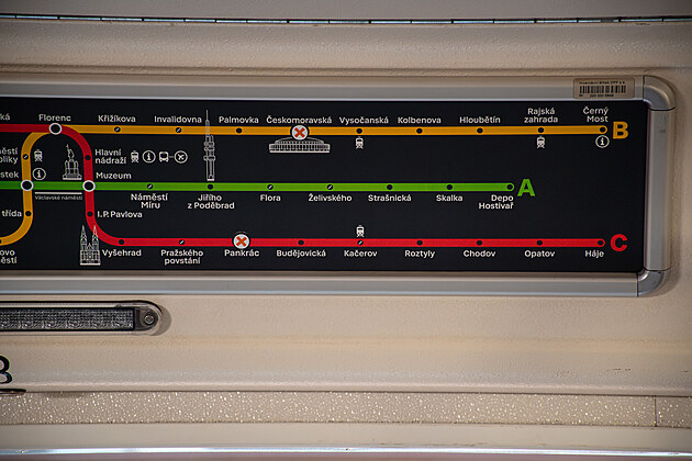 Instalace nových schémat linek pražského metra, tzv. jezevčíků, do vagonů jednotlivých souprav (prosinec 2024)