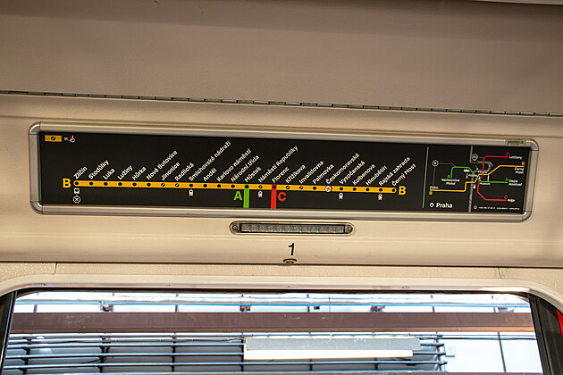 Instalace nových schémat linek pražského metra, tzv. jezevčíků, do vagonů jednotlivých souprav (prosinec 2024)