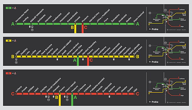 Nová schémata linek pražského metra, tzv. jezevčíci (prosinec 2024)