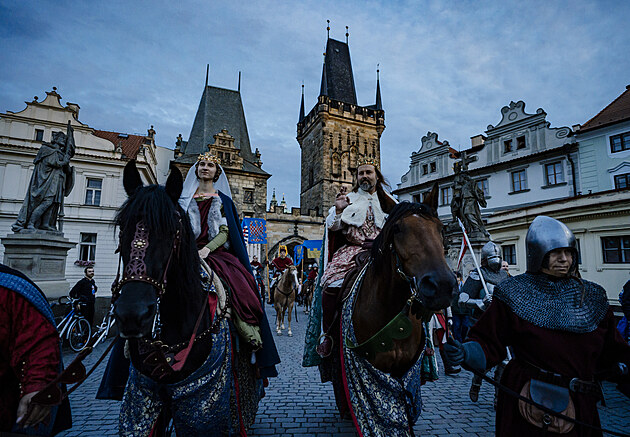 668. výročí položení základního kamene Karlova mostu. Kostýmovaný průvod krále a císaře Karla IV. s chotí. (9. července 2025)