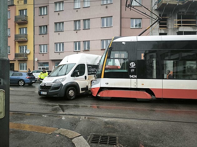 Na Klamovce narazila tramvaj do dodávky. (25. dubna 2025)
