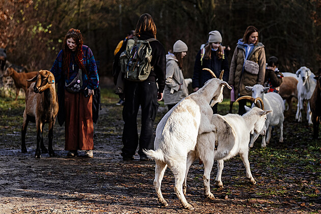 Spolek Pražská pastvina spolu s dobrovolníky hnal stádo koz na novou pastvinu.