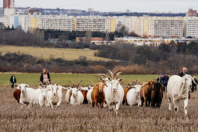 Spolek Pražská pastvina spolu s dobrovolníky hnal stádo koz na novou pastvinu.