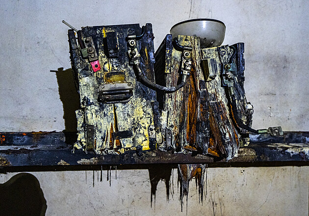 Rozteklé baterie v akumulátorovně záložního řídicího stanoviště pod smíchovským nádražím. Zapomenutý podzemní kryt pod prvním nástupištěm. (21. března 2025)