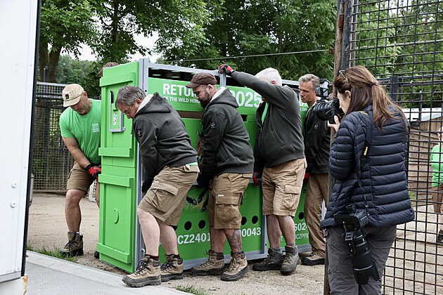 Pracovníci Zoo Praha připravují koně Převalského k transportu. (2. června 2025)
