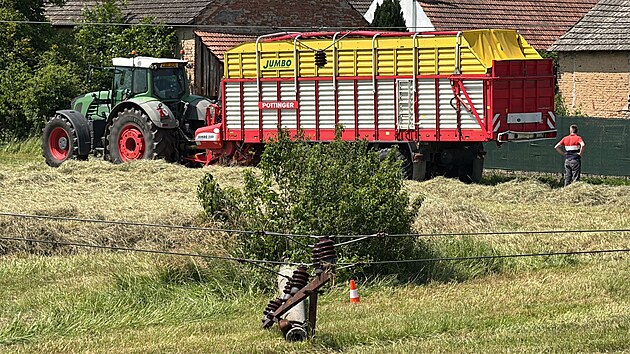 Traktor u Rohozce při kolizi na poli porazil sloup elektrického vedení. Do stržených drátů následně nejela motorka. (12. června 2025)