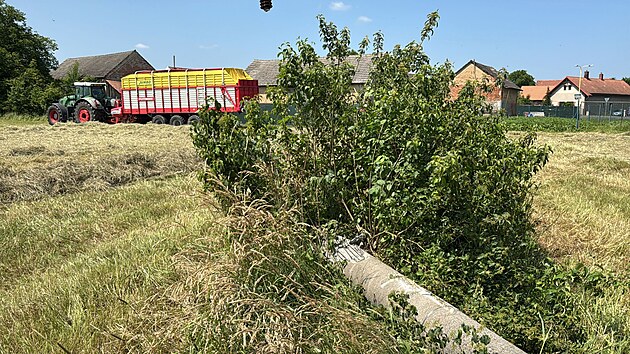 Traktor u Rohozce při kolizi na poli porazil sloup elektrického vedení. Do stržených drátů následně nejela motorka. (12. června 2025)