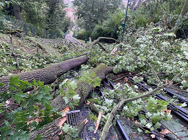 Popadané stromy na trati lanové dráhy na pražský Petřín. Provoz lanovky přerušil dopravní podnik už v pátek večer. (15. září 2024)