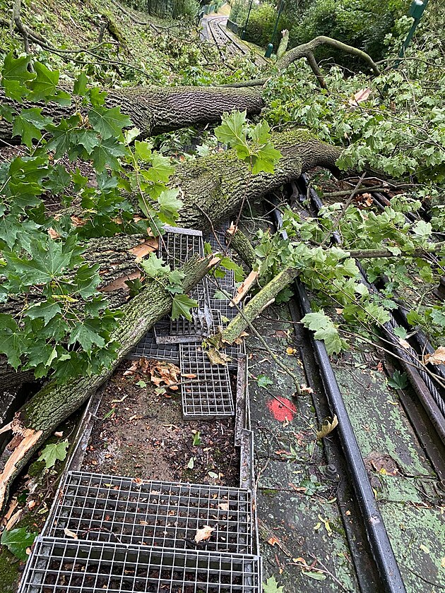 Popadané stromy na trati lanové dráhy na pražský Petřín. Provoz lanovky přerušil dopravní podnik už v pátek večer. (15. září 2024)