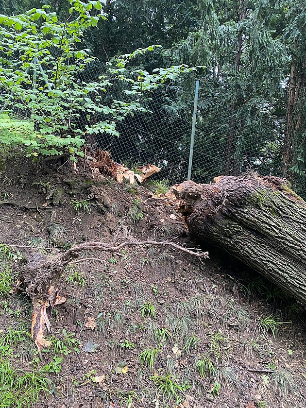 Popadané stromy na trati lanové dráhy na pražský Petřín. Provoz lanovky přerušil dopravní podnik už v pátek večer. (15. září 2024)