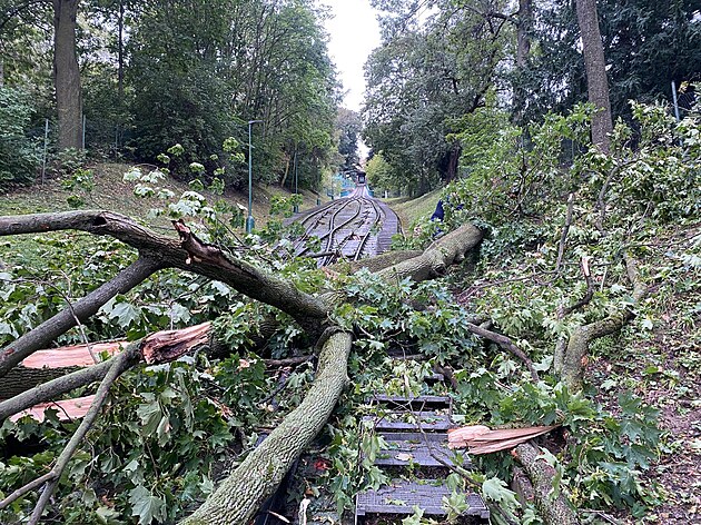 Popadané stromy na trati lanové dráhy na pražský Petřín. Provoz lanovky přerušil dopravní podnik už v pátek večer. (15. září 2024)