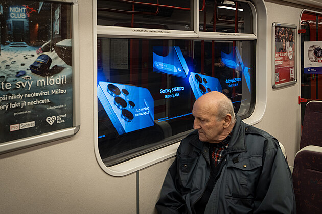Moderní technologie na principu LED panelů umožňuje promítat různá sdělení přímo za okna projíždějícího vlaku metra (25. 2. 2025).