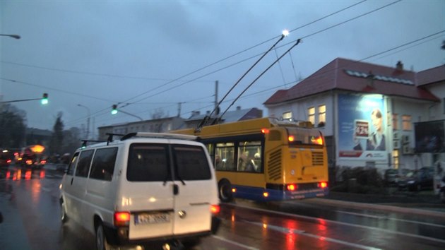 Námraza na trolejích komplikovala ve Zlíně provoz trolejbusů. (1. prosince 2014)