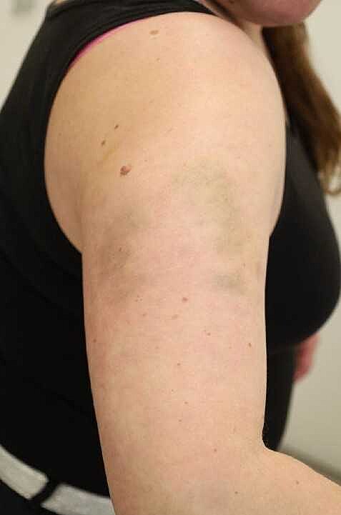 Na ruce ženy zůstaly po útoku modřiny. (4. dubna 2025)
